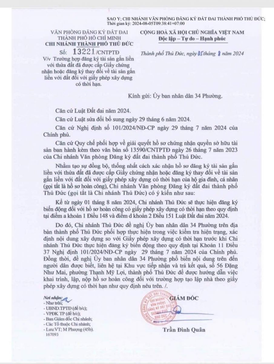 Thành phố Thủ Đức đã cấp giấy phép xây dựng cho ngôi nhà cấp có thời hạn, và việc hoàn công đã được thực hiện từ ngày 01.08.2024.